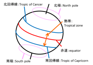 地軸の中央を垂直に割る部分に赤道があり、この赤道と北回帰線(かに座の回帰線)の間、または赤道と南回帰線(やぎ座の回帰線)の間を熱帯と呼びます。赤道は英語でequator北回帰線(かに座の回帰線)Tropic of Cancer南回帰線(やぎ座の回帰線)Tropic of Capricorn熱帯the tropical zone(the Torrid Zone)といいます。北回帰線は北緯23度26分で、南回帰線は南緯23度26分であり、それぞれ地軸の傾きと同じになっています。北緯は英語でnorth latitude南緯south latitudeといいます。北極点と赤道の中間点は北緯45度にあたり、英語でnorthern latitude of 45 degreesといいます。
